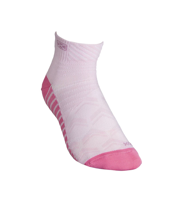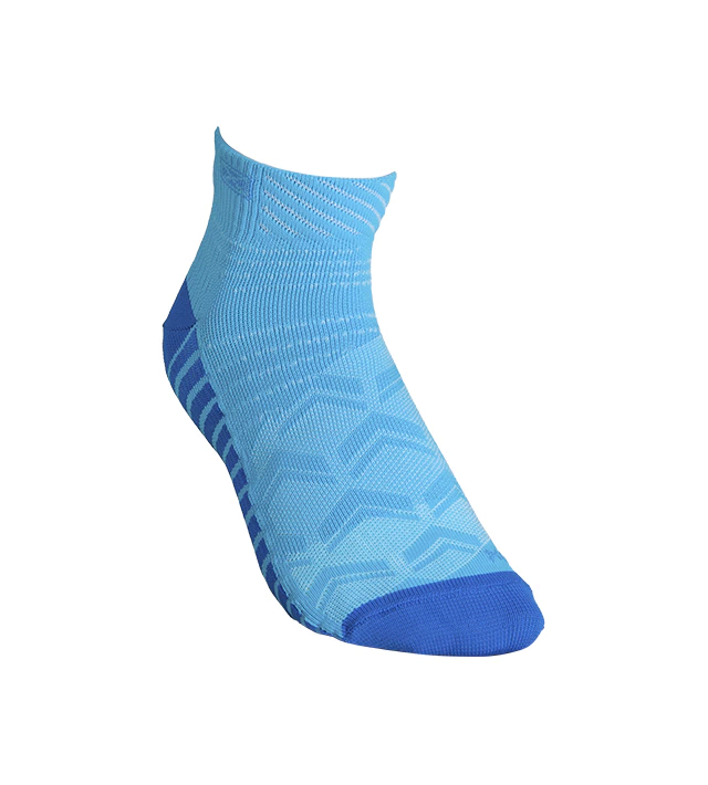 Puño doble, caña corta, caña y pie elastizados para lograr un calce perfecto. Diseño anatómico para pie izquierdo y derecho. Sectores específicos de ventilación para evitar el calentamiento del pie. Talón y puntera reforzados, costura de puntera extra plana. Secado rápido gracias a su composición.