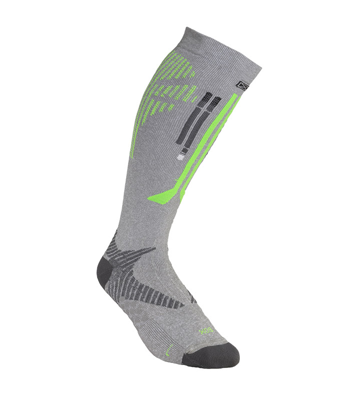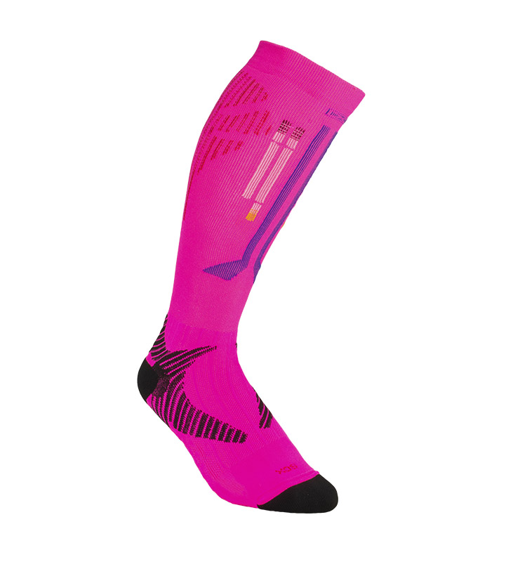 Medias de compresión graduada pensadas para el deportista. Desarrolladas para contribuir a la re-circulación del sistema sanguíneo y a la contención de los músculos. Colaboran en la prevención de la fascitis plantar por la compresión transmetatarsal. El agregado de puntos de contacto permite la relajación de las tensiones propias del pie. Con protector del tendón de Aquiles que reduce la incidencia de los puntos de presión y el riesgo de las lesiones por roce y moretones. Costura de puntera extra plana. Puño doble.Talón y puntera reforzados. Secado rápido gracias a su composición.